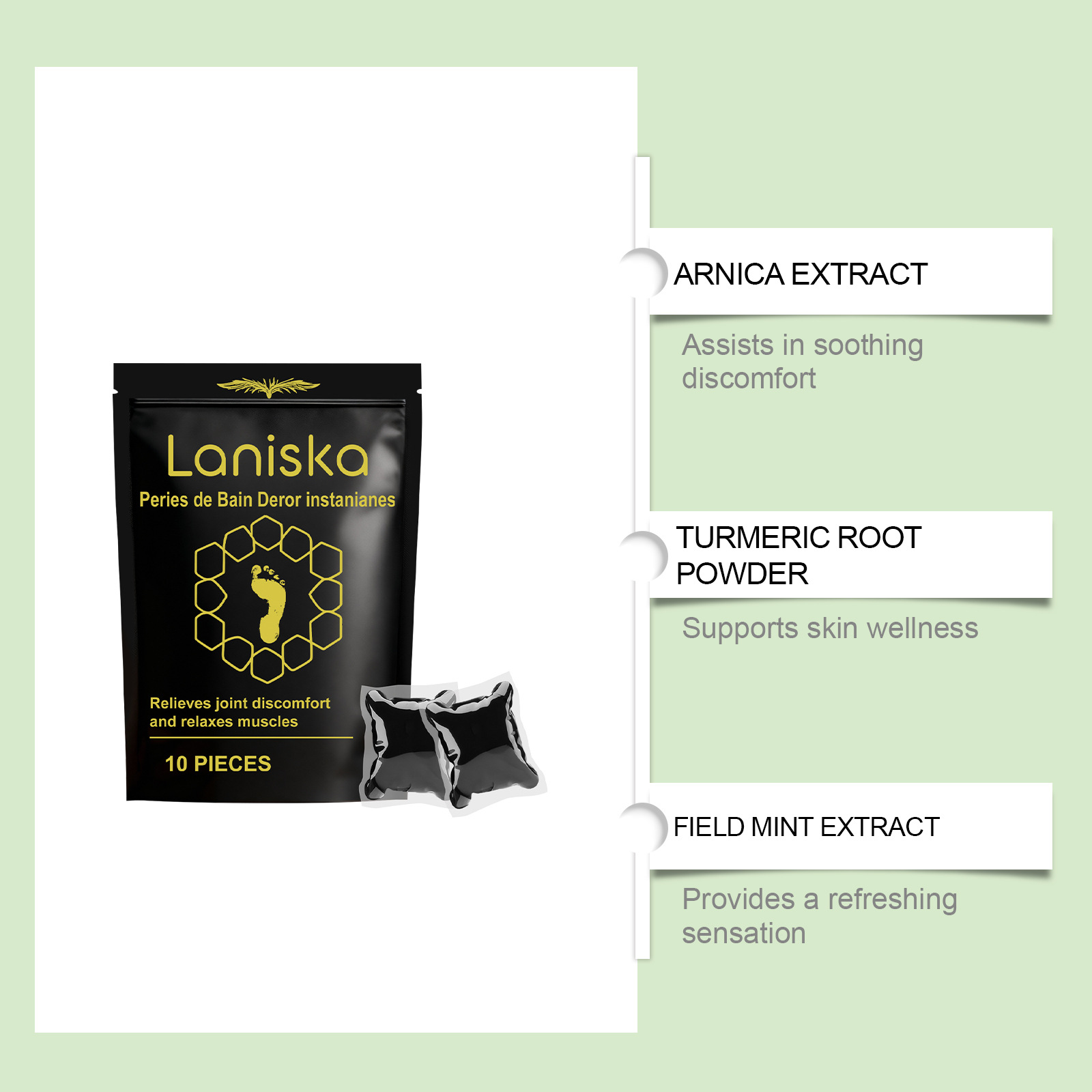 Product information: Active ingredients: Arnica extract, turmeric root powder, peppermint extract and tea extract. Inactive ingredients: water, glycerol, 1,2- hexanediol, carbomer, arginine.